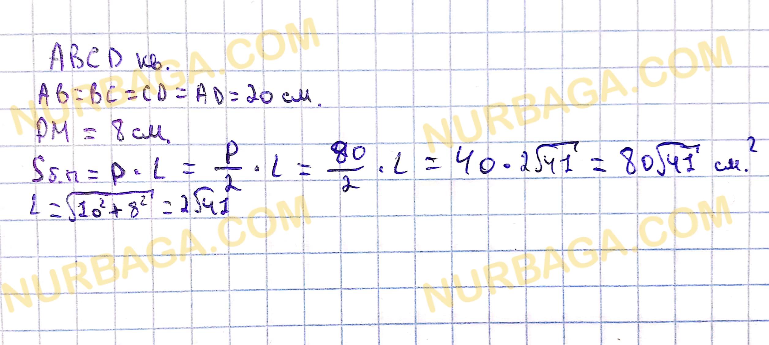 20 см. Высота пирамиды РМ равна 8 см. Найдите площадь боковой поверхности