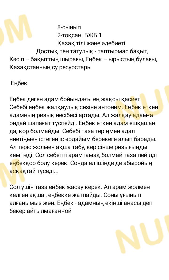 СОР № 1 Казахский язык и литература 8 класс Достық пен татулық - таптырмас бақыт, Кәсіп – бақыттың шырағы, Еңбек – ырыстың бұлағы, Қазақстанның су ресурстары