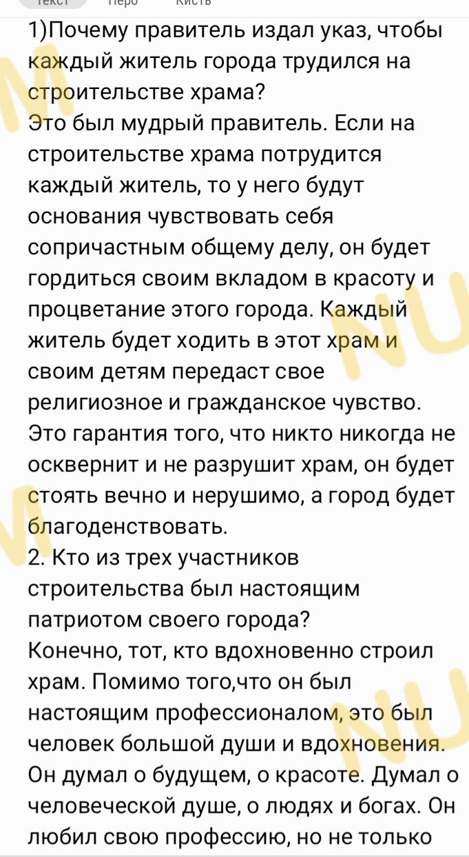 Ответив так, все бросил и ушел. Спросил второго: – Милый человек, что делаешь? – Дом строю, – был ответ. Тон равнодушный, равнодушный взгляд: – Я отработал час. Прощай, мой брат! Спросил он третьего: – Ты скажешь мне иль нет, что делаете вы? – О, – был ответ, – я строю Храм! Вот стены возвожу… Уютно будет в нем, я вам скажу! Как хорошо в нем будет! Как светло! Прохладно летом, а зимой тепло! Как замечательно молиться будет там – Приют душе, и людям, и Богам! Лицо его светилось изнутри. – Я все хочу спросить тебя, прости, – сказал прохожий, — Только разве час не отработал ты? Уж день погас, а ты все трудишься, не покладая рук… – Ну что ты говоришь такое, друг! Сюда я с удовольствием иду. Здесь забываю все: сон и еду, … Мне нравится профессия моя! Ее люблю и ей доволен я. Как думаешь, читатель, кто из них Красивый чудный Божий храм воздвиг? Тот, кто горбатился? Кто равнодушен был? Иль тот, кто душу в этот Храм вложил? Смысл притчи ясен: Коли любишь ты свою работу – Будут и плоды! (источник https://www.stihi.ru/2015/08/20/5809)