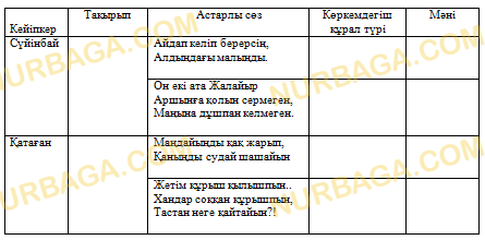 Айтыстағы кейіпкерлердің тілге тиек еткен сөз түйдектерін негізге ала отырып, олардың қолданылу ерекшеліктерін кестеге түсіріңіз.