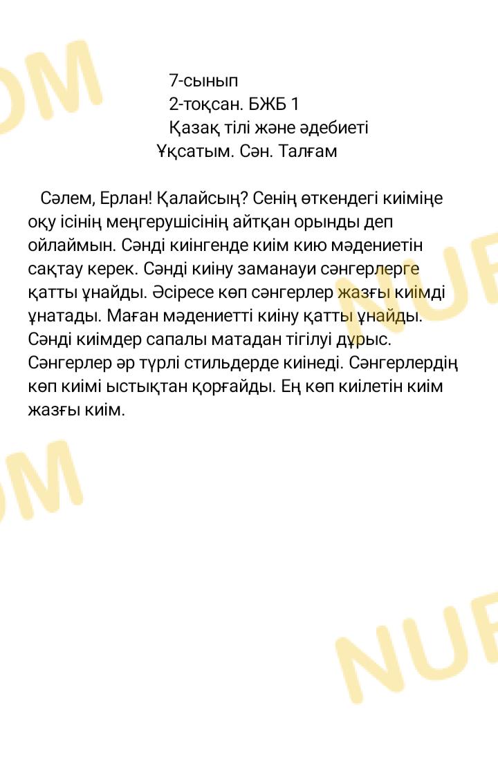Хаттағы ойды жалғастырып, досыңызға «Сәнді де жарасымды киіне білу – өнер» екенін айтып, күрделі және оқшау сөздерді қолданып, хат жазыңыз. Хатта төмендегі мәселелер туралы айтыңыз: • сыртқы келбетке сай киіну; • киім кию мәдениетін сақтау; • жағдайға байланысты киіну.