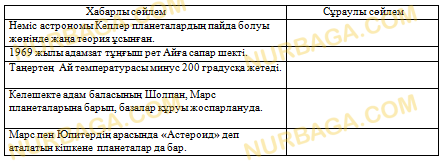Берілген сөйлемдерді мұқият оқыңыз. Сұрау есімдіктерін қолдана отырып, әр сөйлемді сұраулы сөйлемге айналдырыңыз.