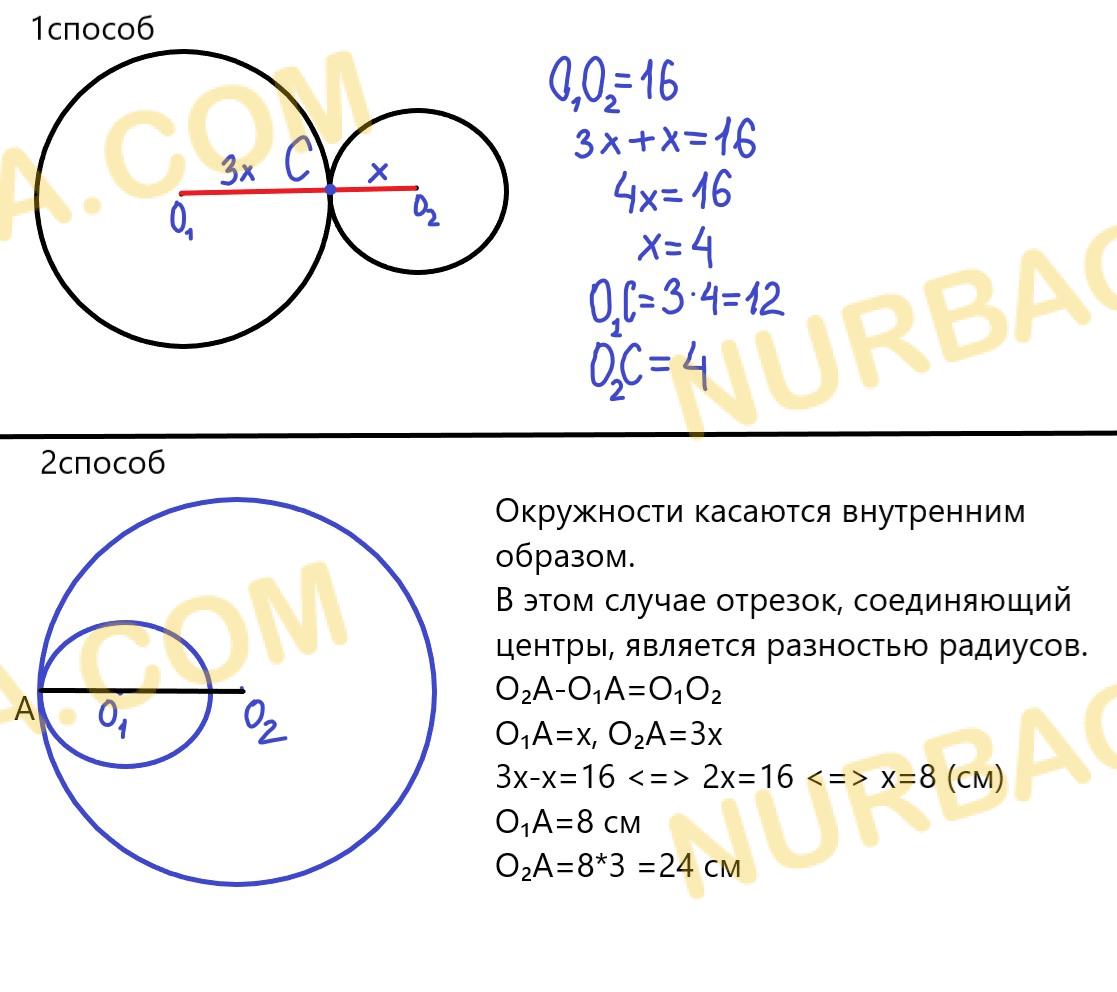 Найдите радиусы двух касающихся окружностей, если они пропорциональны числам 1 и 3, а расстояние между центрами окружностей равно 16 см. Рассмотрите два варианта.