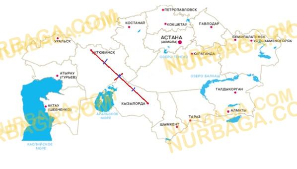 Отметьте на карте Казахстана точку, находящуюся на одинаковом расстоянии от городов Актобе и Кызылорда.