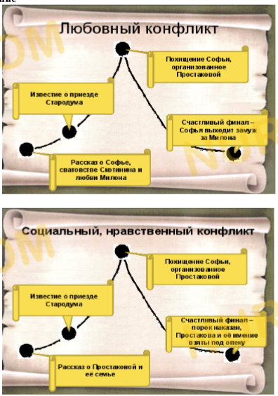В комедии Д.И.Фонвизина «Недоросль» две сюжетные линии. Одна разрешает любовный конфликт, другая – социальный, нравственный. Выберите одну сюжетную линию и перескажите содержание произведения с учетом связанного с ней конфликта. Выразите свое мнение о событиях и героях, причастных к конфликту.