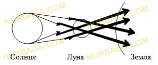 Прочитайте условие задачи. Если Луна при своем движении окажется между Землей и Солнцем, то она будет отбрасывать на Землю тень. Покажите ход солнечных лучей, и зарисуйте образование области тени и полутени