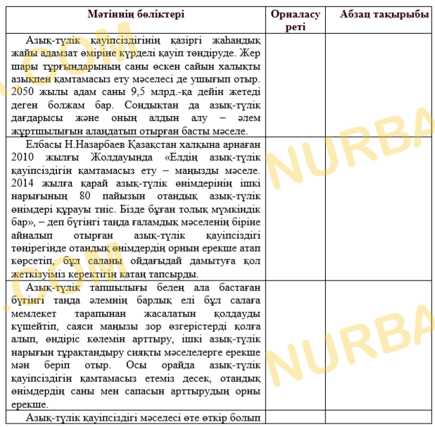 1. Мәтіндегі абзацтардың ретін анықтап, әр абзацтағы негізгі ойға қатысты ат қойыңыз. Азық-түлік қауіпсіздігі – ғаламдық мәселе