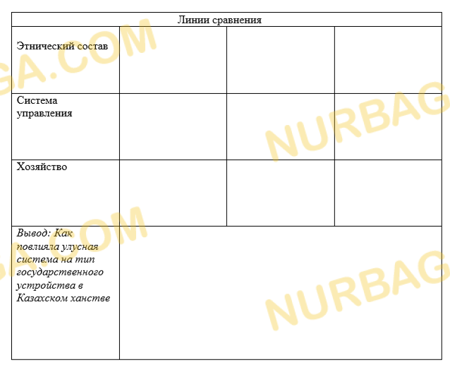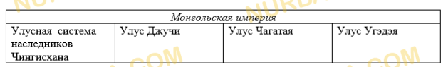 Используя текст и собственные знания определите и сравните особенности управления в улусной системе наследников Чингисхана и напишите вывод. Завоеванные территории Чингисхан поделил между своими четырьмя сыновьями. Земли Казахстана полностью перешли в руки его трех сыновей. Розданные земли стали называться улусами. После монгольского завоевания в Степи утвердилось чингизидство. Всех чингизидов стали относить к «белой кости» или «торе». Только потомки Чингисхана – ханы и султаны составляли закрытую самим происхождением корпоративную группу правителей «Степи». Улусу Жошы (Джучи), старшего сына Чингисхана, принадлежали земли к востоку от Иртыша до Восточной Европы, куда дошли монгольские завоеватели. На территории Казахстана к улусу Жошы относились восточная часть Дешт-и-Кыпчакской степи, Приаралье, нижнее течение Сырдарьи и Северо-восточная часть Жетысу, весь Центральный, Северный и Западный Казахстан. Судя по некоторым источникам, центр улуса находился на берегу Иртыша, а по другим – у слияния рек Сарысу и Кенгир. По всей вероятности, вторая версия ближе к истине, потому что захоронение Жошы (Джучи) находится в местности этого междуречья. В улус Чагатая, второго сына Чингисхана, входили Юг и Юго- восток Казахстана (Жетысу), а также Средняя Азия. Центром улуса являлся город Алмалы. Летняя ставка Чагатая располагалась в местности Куяш на берегу реки Или. В состав улуса входили также земли Восточного Туркестана. Во владения улуса Угедея, третьего сына Чингисхана, входили земли Западной Монголии, Алтая, Тарбагатая, верхнее течение Иртыша. После получения титула хана он жил в Каракоруме на берегу реки Орхон. Младший сын Чингисхана Тулуй правил Монголией. Между этими улусами, которые управлялись путем насилия и произвола, не было никаких политических, экономических и этнических связей. Между улусами все время происходили междоусобные распри за власть и захват территории. Со временем, после смерти Чингисхана в 1227 году, родственные отношения между его сыновьями были практически прекращены. После смерти в 1259 году великого монгольского хана Монке междоусобная борьба между потомками Чингисхана еще более обострилась.