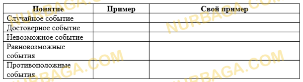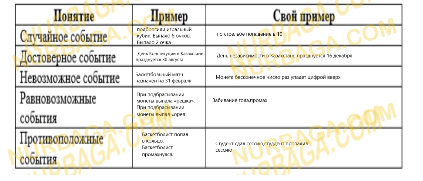 — День Конституции в Казахстане празднуется 30 августа. — Баскетбольный матч назначен на 31 февраля. — Баскетболист совершил “трёхочковый” бросок. — Баскетболист попал в кольцо. Баскетболист промахнулся. — Сегодня вы празднуете свой день рождения. — Айсулу подарили красные, синие и зеленые шары. Она нечаянно лопнула черный шар. — Подбросили игральный кубик. Выпало 6 очков. Выпало 2 очка. — При подбрасывании монеты выпала «решка». При подбрасывании монеты выпал «орел». — В коробке находятся красные шары. Наудачу извлеченный шар – красный.