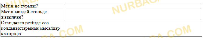 1. Мәтінді оқып, оның қандай стильде жазылғанын анықтаңыз және ерекше сөз қолданыстарынан мысалдар келтіріңіз.