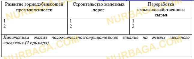 Используя текст и полученные знания, опишите по два изменения в экономике для каждой из указанных отраслей. Сделайте вывод о влиянии капитализма на жизнь местного населения. В XIX веке в Казахстан начинают проникать капиталистические отношения. Одним из первых получает разрешение властей и начинает разработку свинцово-серебряных руд, перевозит их по Иртышу на алтайские металлургические заводы томский предприниматель Попов. Царское правительство рассматривало Казахстан только как источник сырья для метрополии. Поэтому найденные казахами рудники и копи не давали разрабатывать самим казахам. Саранские угольные шахты и Спасский медеплавильный завод также принадлежали русским предпринимателям Ушакову и Рязанову. Главными товарами, которыми торговали местные жители, были скот и продукция скотоводства, для продажи прогоняли за лето несколько сот тысяч голов разного скота. Из России в Казахстан ввозили сахар, галантерею и другие мануфактурные изделия, а вывозили скот и сырье. С вводом железных дорог товарооборот увеличился. Стали вывозиться и продукты земледелия, у которых возросли товарные качества. https://e-history.kz/media/scorm/378/text/text.htm