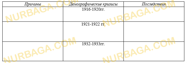 1922-1923гг. причины – политика военного коммунизма, засуха, голод. Последствия – население Казахстана сократилось в 1923 г. — до 3 786 910 чел.