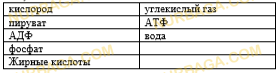 b) Во время дыхания между цитоплазмой и митохондрией происходит транспорт соединений. Заполните таблицу, ниже написав два соединения, которые входят в митохондрию и два соединения, которые покидают митохондрию.