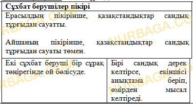 2. Екі сұхбат берушінің көзқарастарын салыстырыңыз. Ұқсастығы мен айырмашылығын анықтаңыз. Жауаптарыңызды сөз тіркесімен беріңіз.
