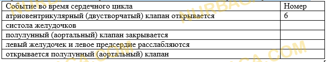 В приведенной ниже таблице, сопоставьте каждое событие во время сердечного цикла с соответствующей номером 1-7 на рисунке 11.1. Вы должны поместить только один номер в каждый квадрат. Вы можете использовать каждый номер один раз, более одного раза или совсем не использовать. Первый квадрат заполнен.