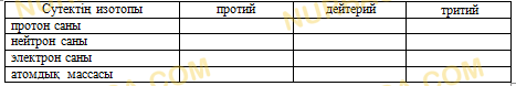 дейтерий D (масса атомдық 2): р=1 е=1 n=2-1=1 тритий T (масса атомдық ):p=1 e=1 n=3-1=2