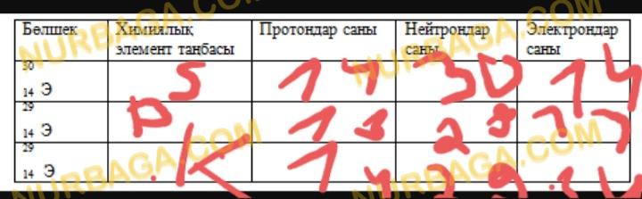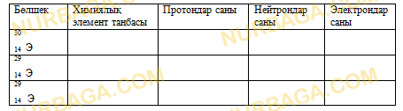 Төмендегі кестеде берілген белгісіз изотоптарға сәйкес химиялық элементті анықтап, изотоптардың протон, нейтрон, электрон сандарын анықтаңыз.