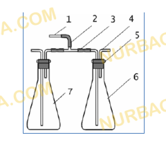 Құралдар мен реактивтер: 50 мл конус тәрізді колба, Г-тәрізді екі газ өткізгіш түтік, шыныдан жасалған мундшук, резеңке түтіктің үш кесіндісі, Т-тәрізді шыны үштігі (тройник), әк суы, тығын, дезинфекциялаушы ерітінді.
