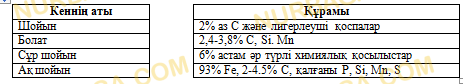 Темір және оның қоспаларынан тұратын қара металлургия құймаларын (шойын, болат) құрамындағы металдарға және басқа элементтерге қарап сәйкестендіріңіз.