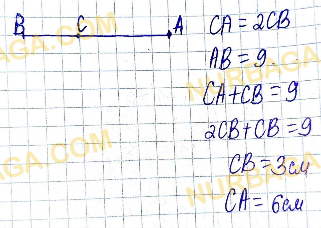 Ұзындығы 9 см болатын АВ кесіндісін салыңыз. С нүктесі АВ түзуінде жатады. Егер