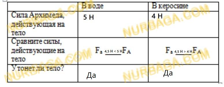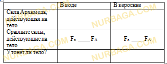 Заполните таблицу (Плотность воды 1000 кг/м3, керосина 800 кг/м3).