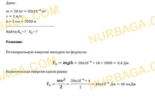 а) Капля дождя массой 20 мг движется со скоростью 2 м/с на высоте 2 км. Вычислите потенциальную энергию, которой обладает капля?